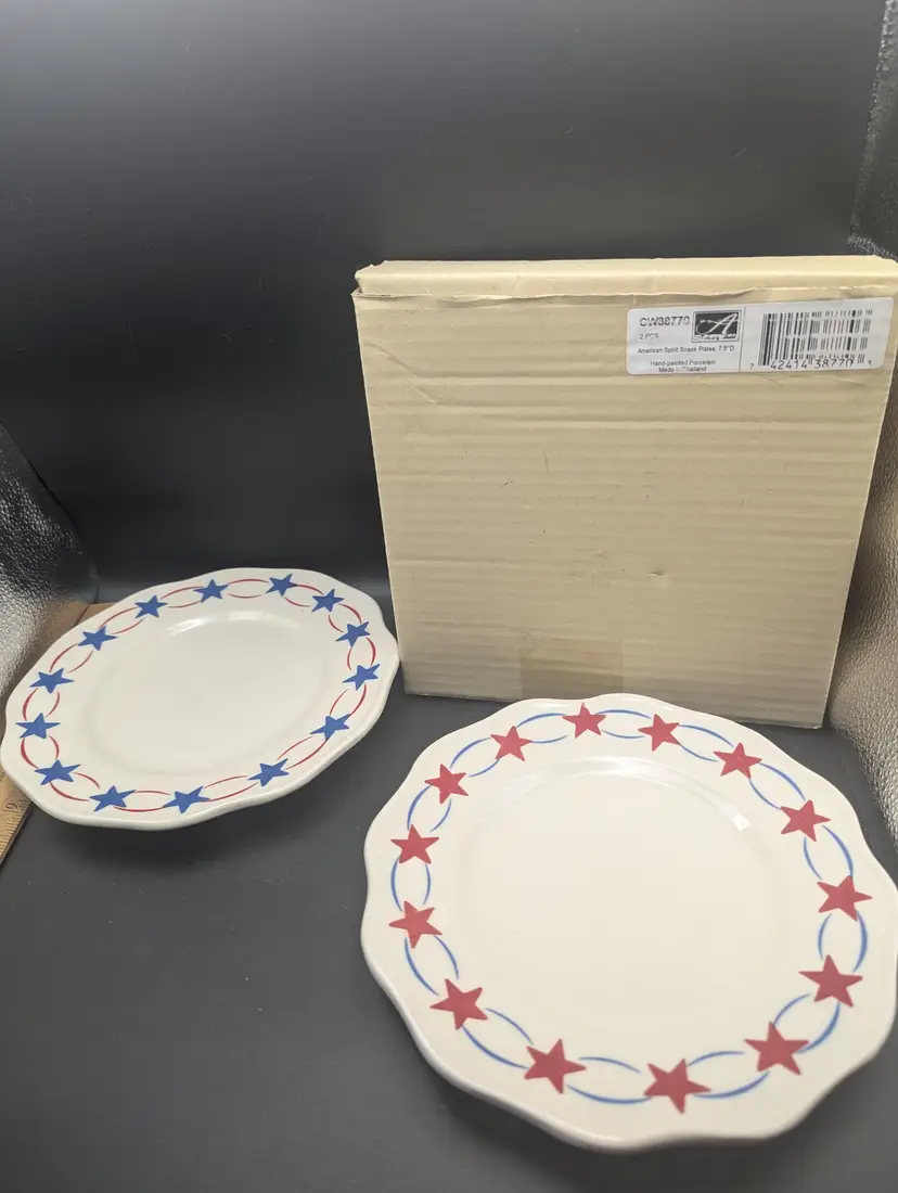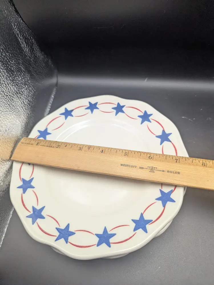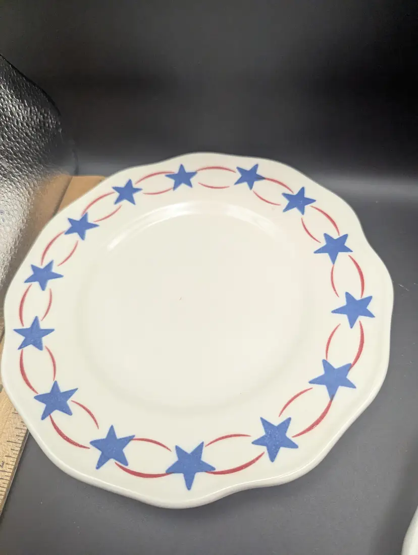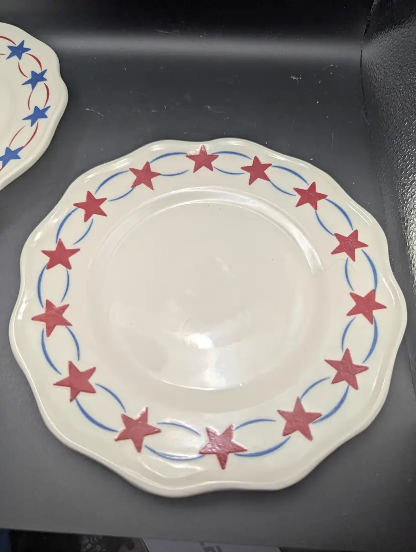 Add a touch of Americana to your dining with these vintage ceramic plates featuring a charming red and blue star pattern. Perfect for collectors or everyday use. Please see all pictures for condition and measurements.