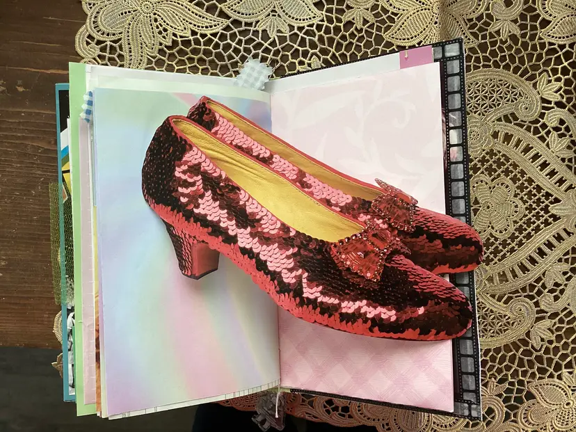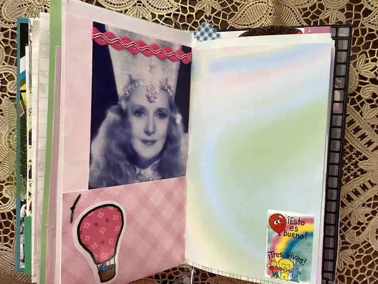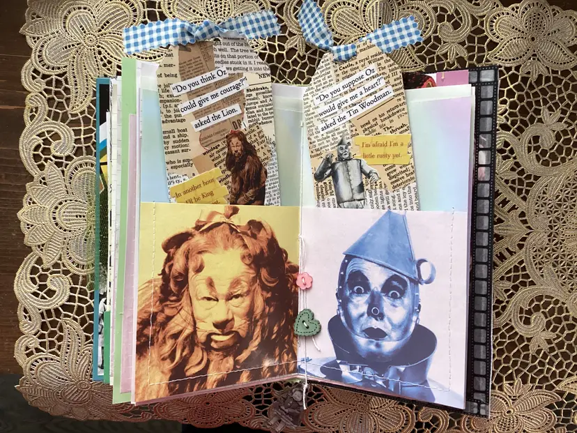 The journal is made from a VHS tape cover which measures 7 1/4x4 1/4” with a spine a little less than 1 1/4”. It contains 50 pages and is full of original ephemera from the booklet that came with tape, a Wizard of Oz calendar, pictures from children’s books plus additional pieces.