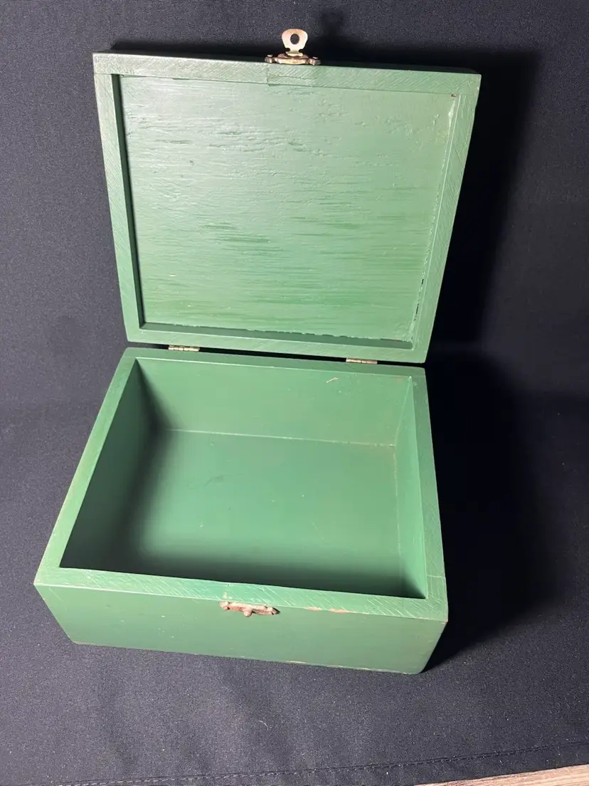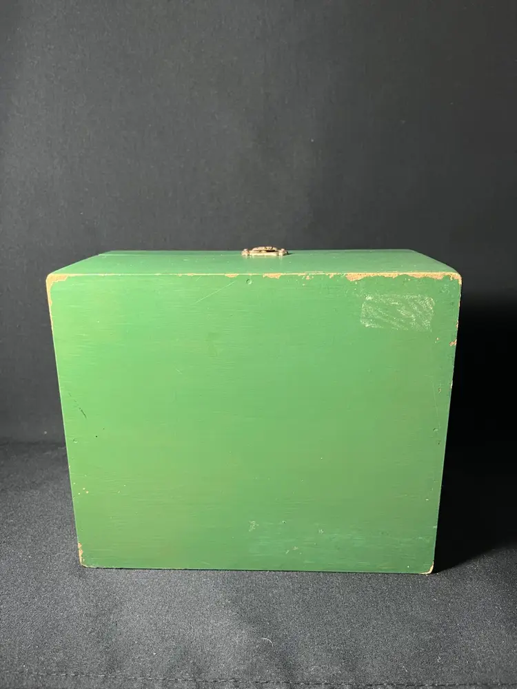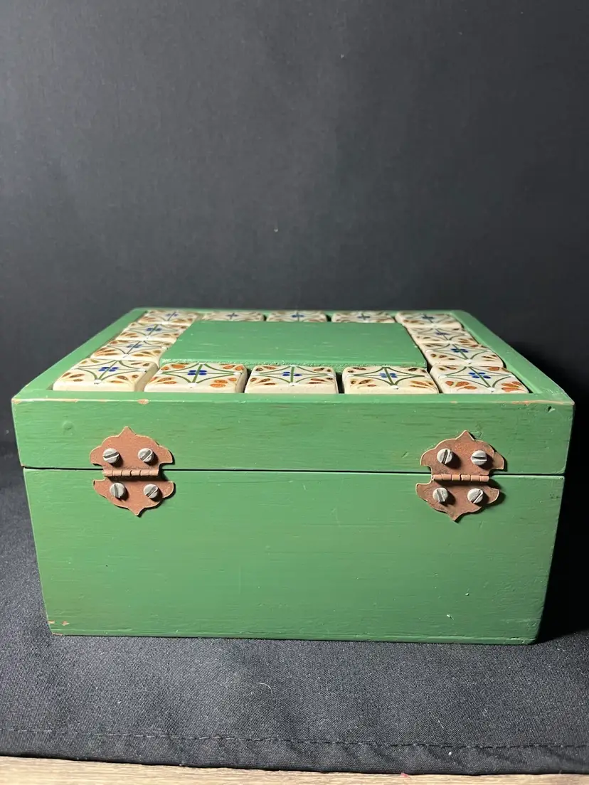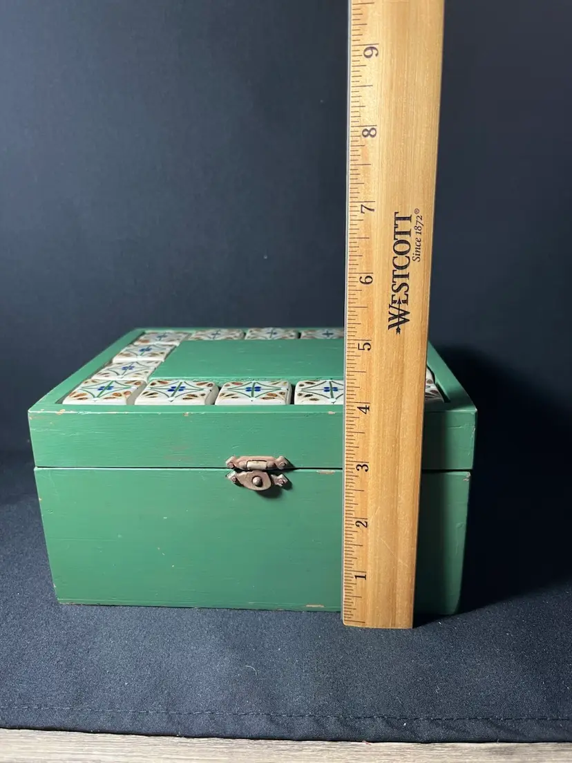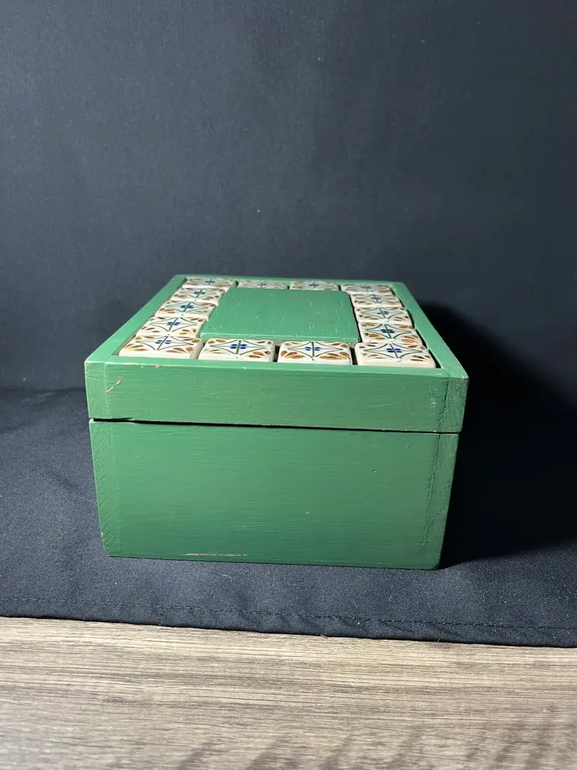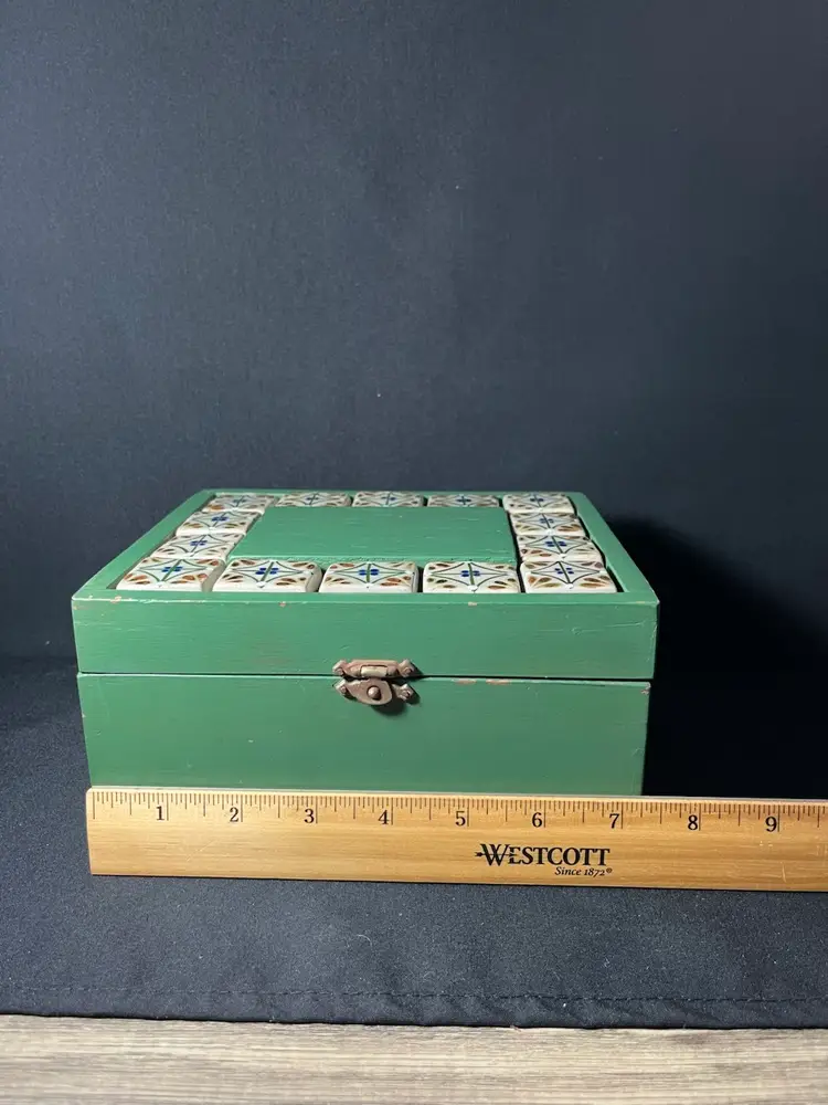 #203 Green Wood Box With Ceramic Tiles on the top to form a decorative border and a latch. Measures 7.5” x 6.5”. Beautiful shade of green. Box does have some wear due to age as seen in photos. Great for a desk or entryway catch all.