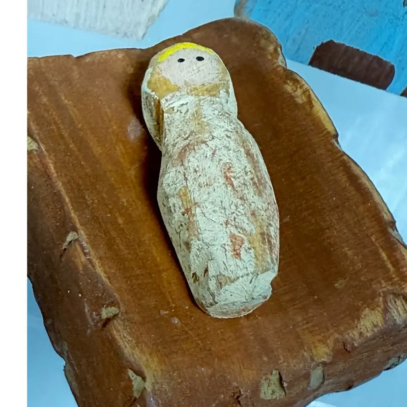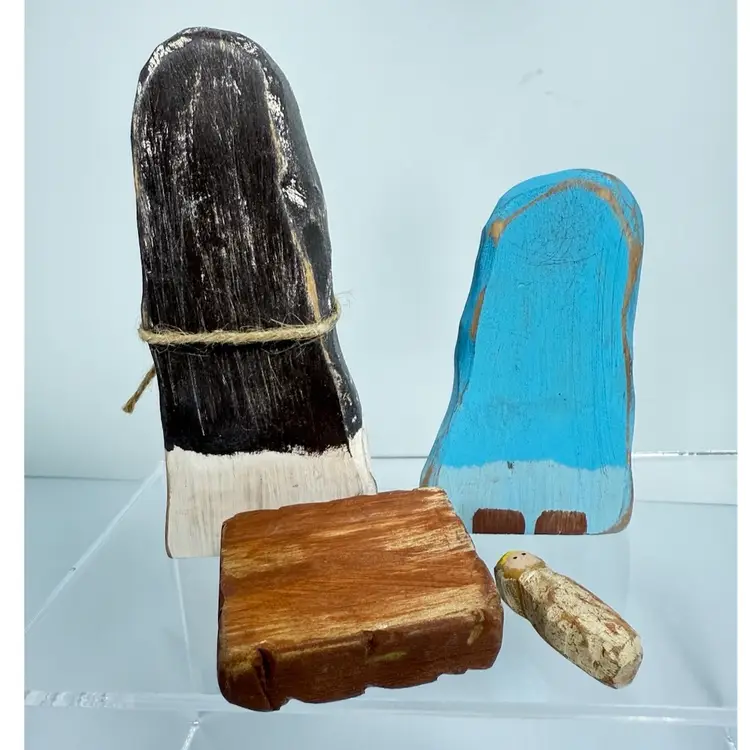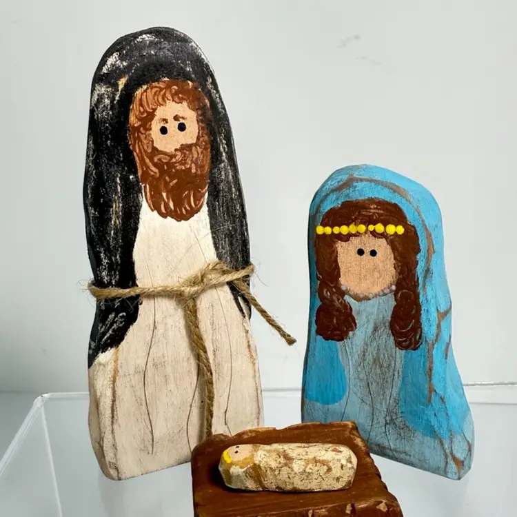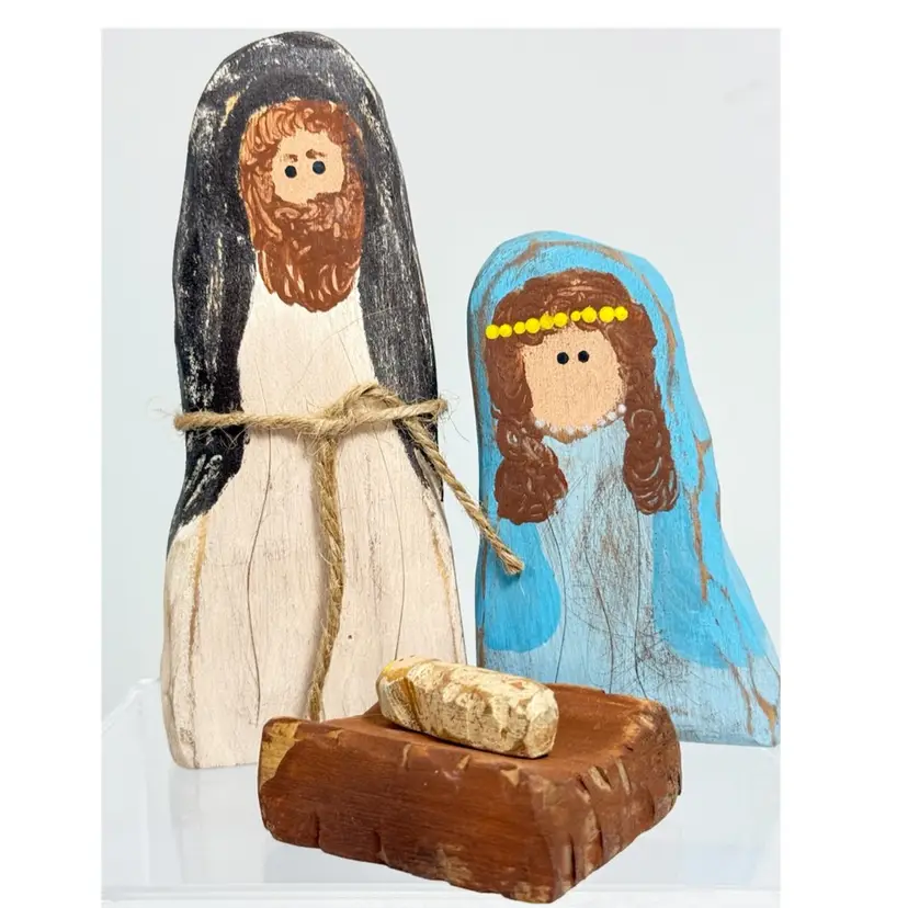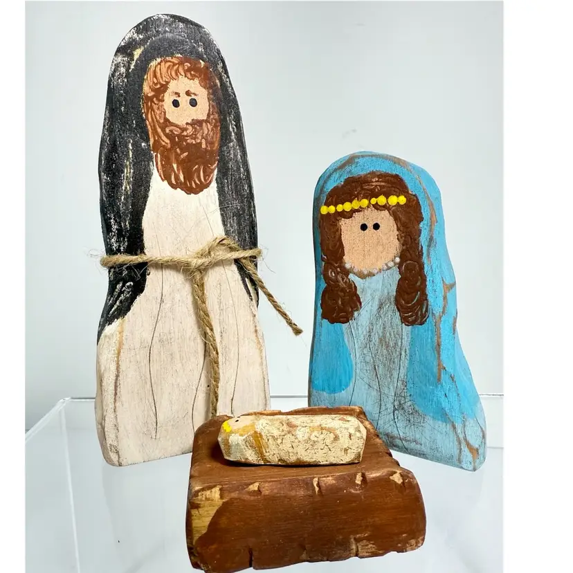Primitive or Rustic, this Holy Family is hand crafted wood, hand painted and ready for your Christmas display. Joseph stands approximately 5" tall, Mary approximately 3.5" tall, Jesus is small at approximately 1.25 inches. Sold as shown, please see all photos.