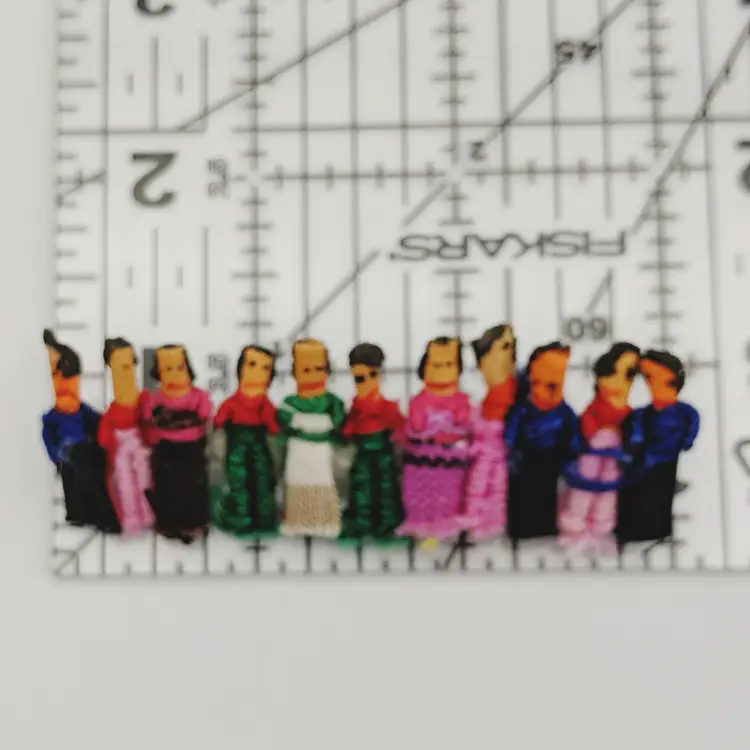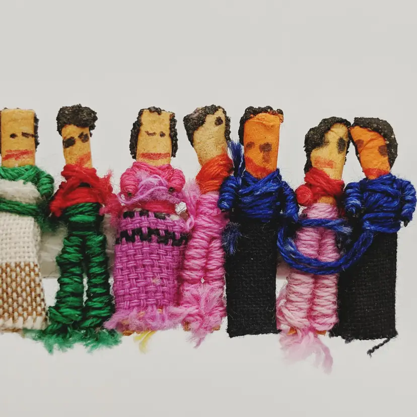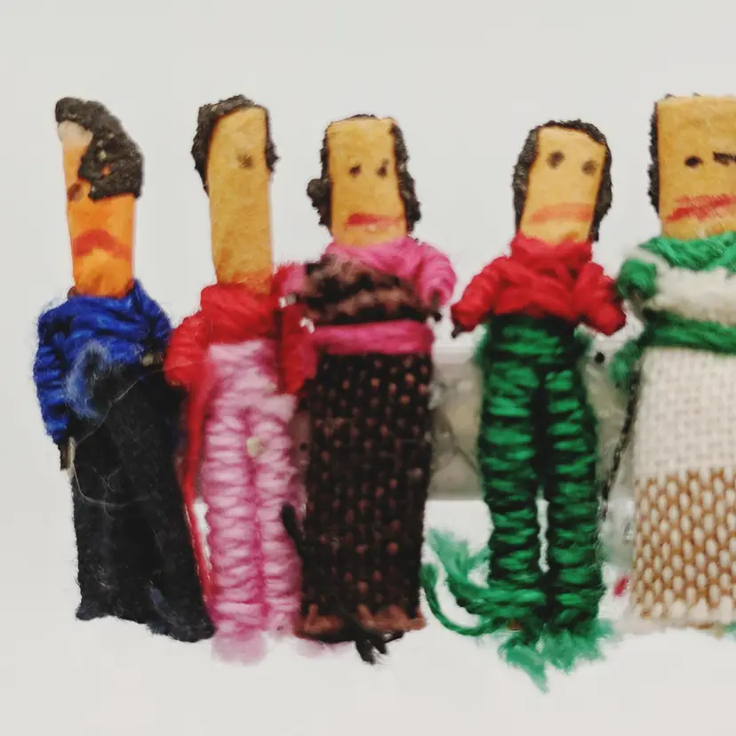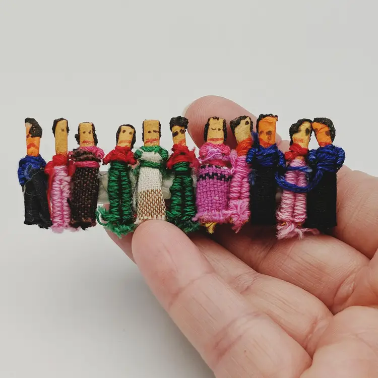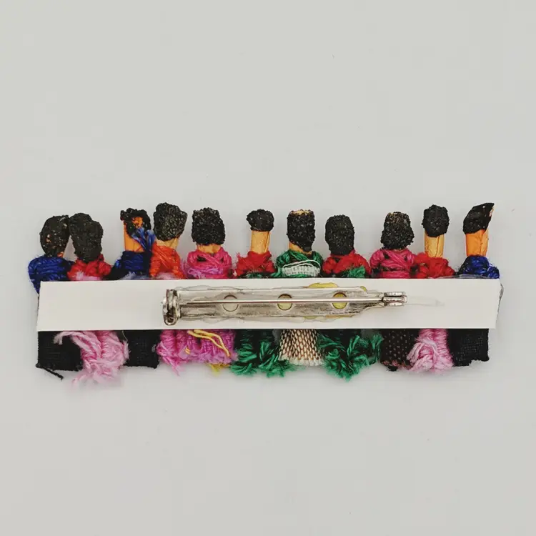 This colorful fabric brooch features a cluster of worry dolls, handmade in Guatemala from cotton and wool materials.