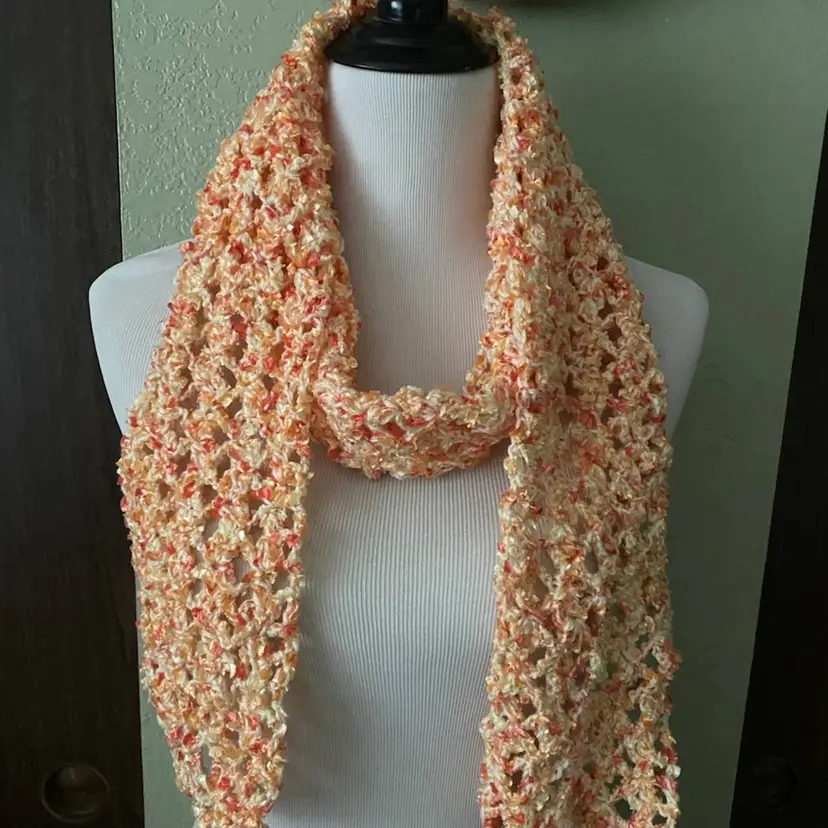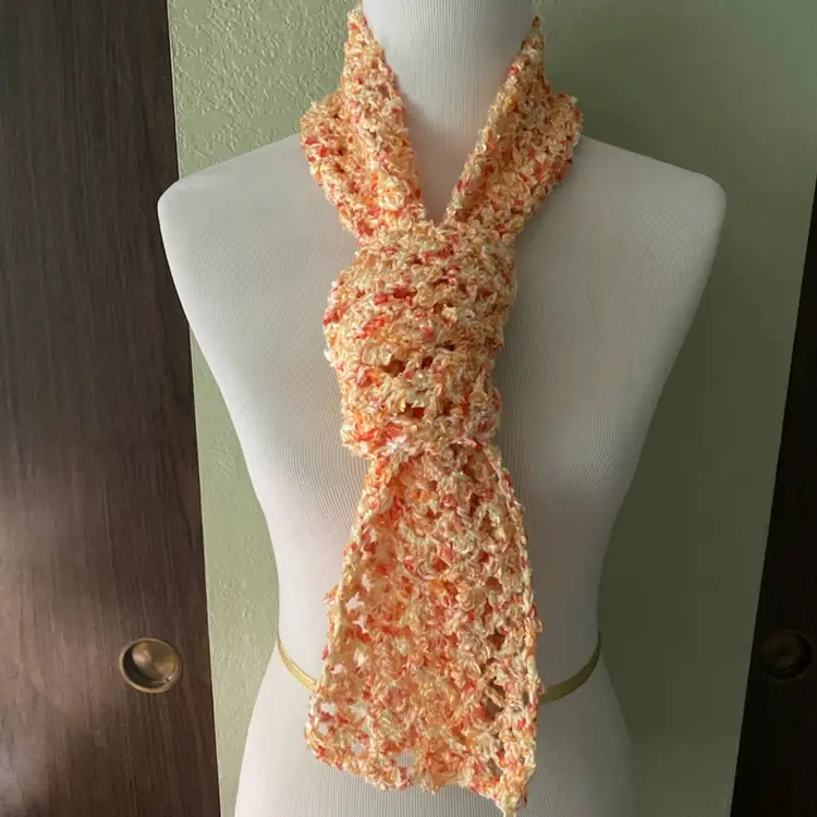 Wrap this beautiful lace crochet long scarf around your neck. Lightweight enough to wear on cool spring days or in fall and winter 2 plys of yarn pastel yellow baby yarn orange & yellow novelty yarn soft and cozy lace pattern measures approx 5" wide x 65" long hand wash, dry flat.